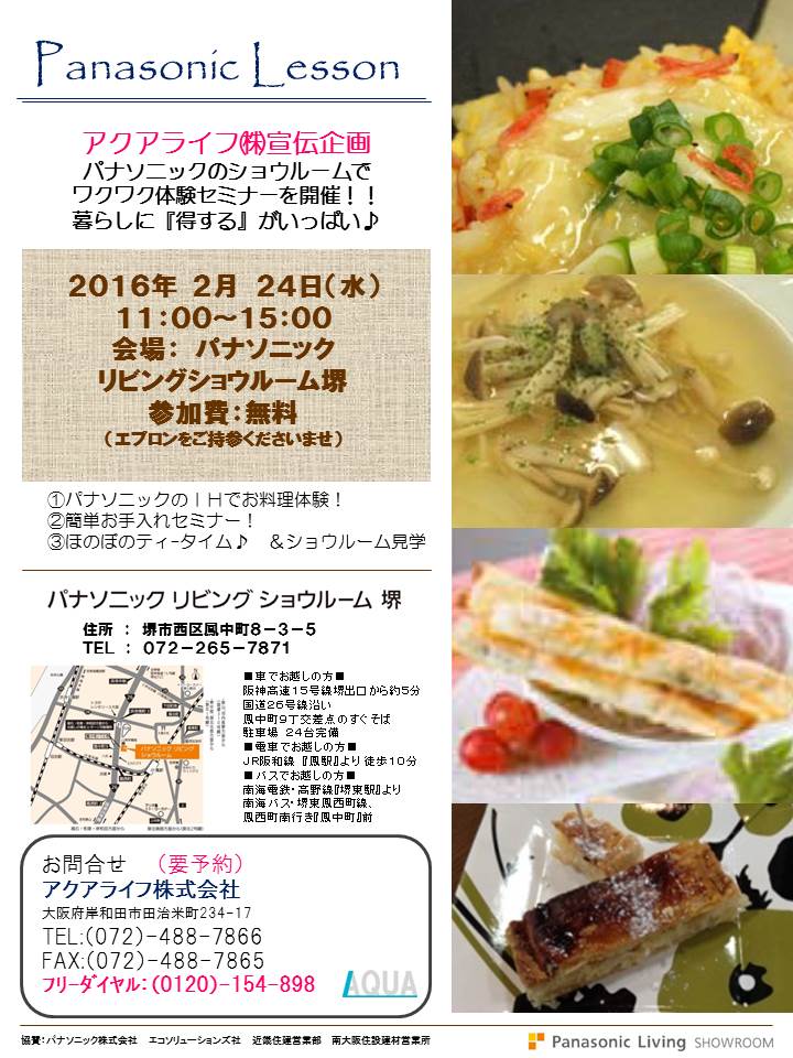 本日アクアライフ株式会社では、昨年堺市に新しくオ-プンしたPanasonicのショ-ル-ムにてIHを使ったお料理教室を開催致します。