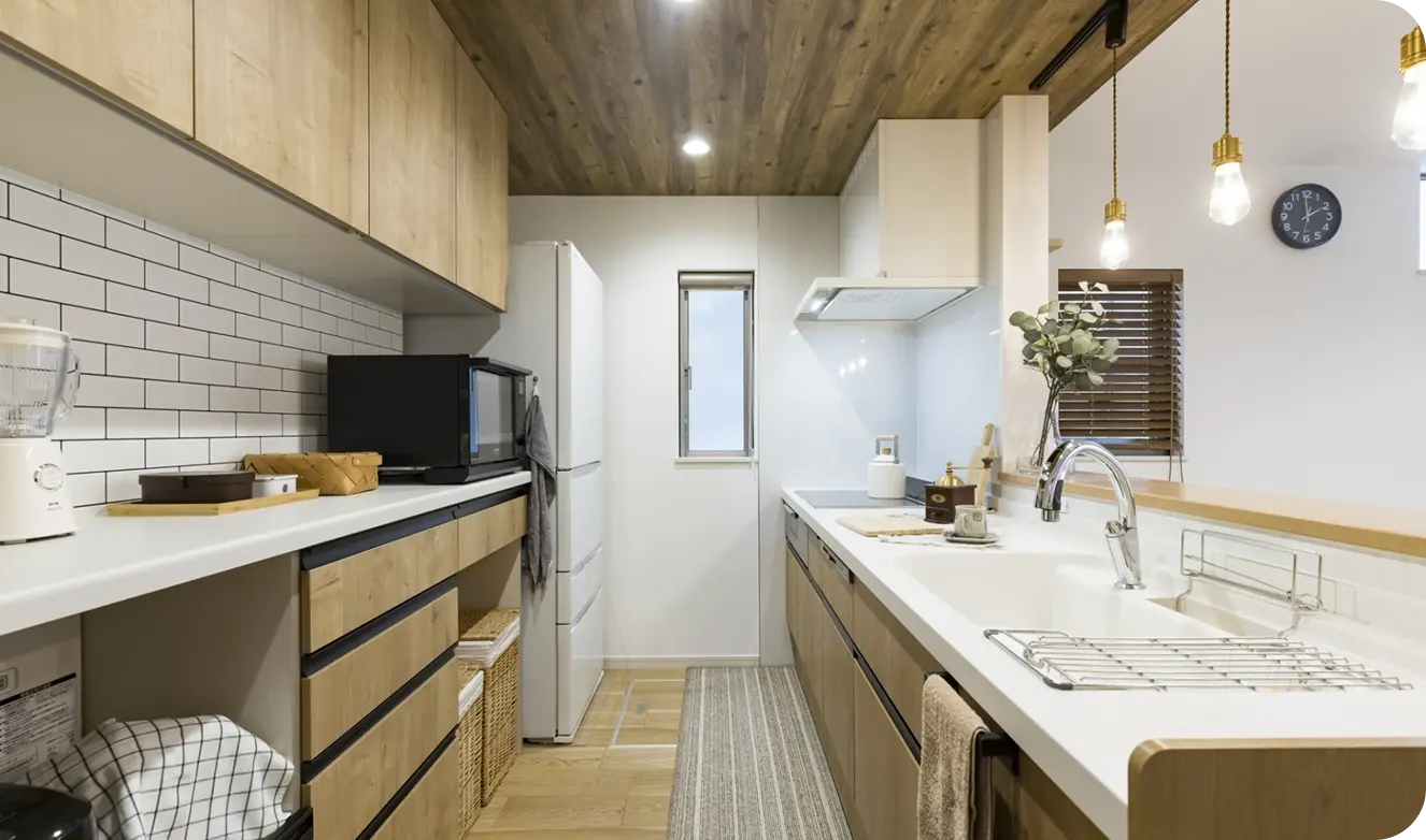 L型や対面キッチンなど、空間の広がりを活かしたレイアウト提案で、動きやすく快適な作業空間を実現します。家事導線を見直すことで、調理・配膳・片付けの効率もぐんとアップします。またキッチンの場所を変更もできます。