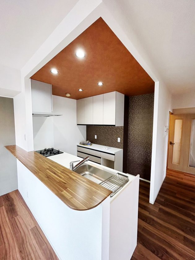 工事後1 キッチン 照明はダウンライトになり、吊り戸棚をなくしました。全体的に明るいスペ-スに生まれ変わりました♪