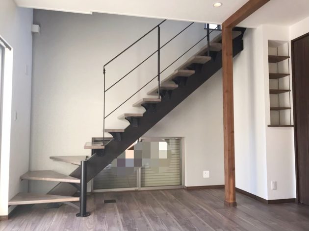 工事後5 リビング階段 一番のお気に入り❤️になったそうです。和室部分を無くしリビング階段を設置しました。「ただいま~」「おかえり~」が顔を見て言えるようにしたい!という奥様のお気持ちがカタチになりました。階段下にはテレビを配置します。壁には造作飾り棚を設置。